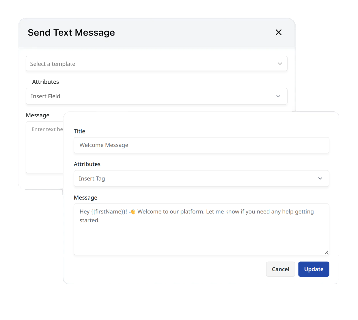 Design messages once and reuse them across your team for consistent, personalized communication. Perfect for emails, WhatsApp, SMS, and in-app messaging.