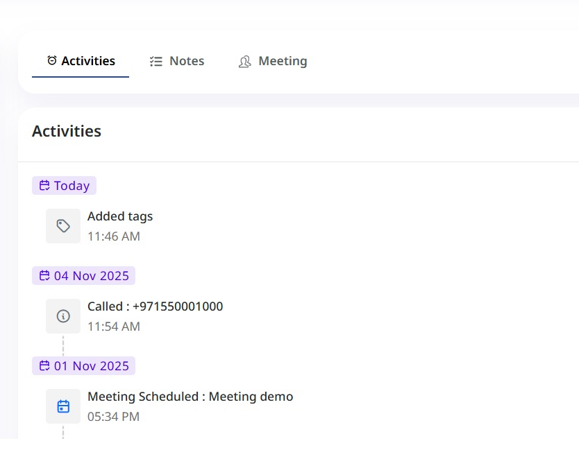 Bring leads directly into your CRM through web forms, email, integrations, and manual entry. All details—name, email, phone number, company, and source—are stored in a centralized system.